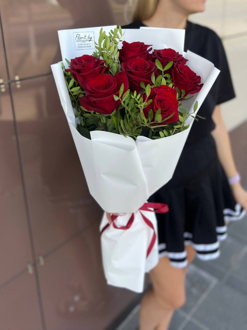 Состав: Роза 7 шт, фисташка, упаковка, лента