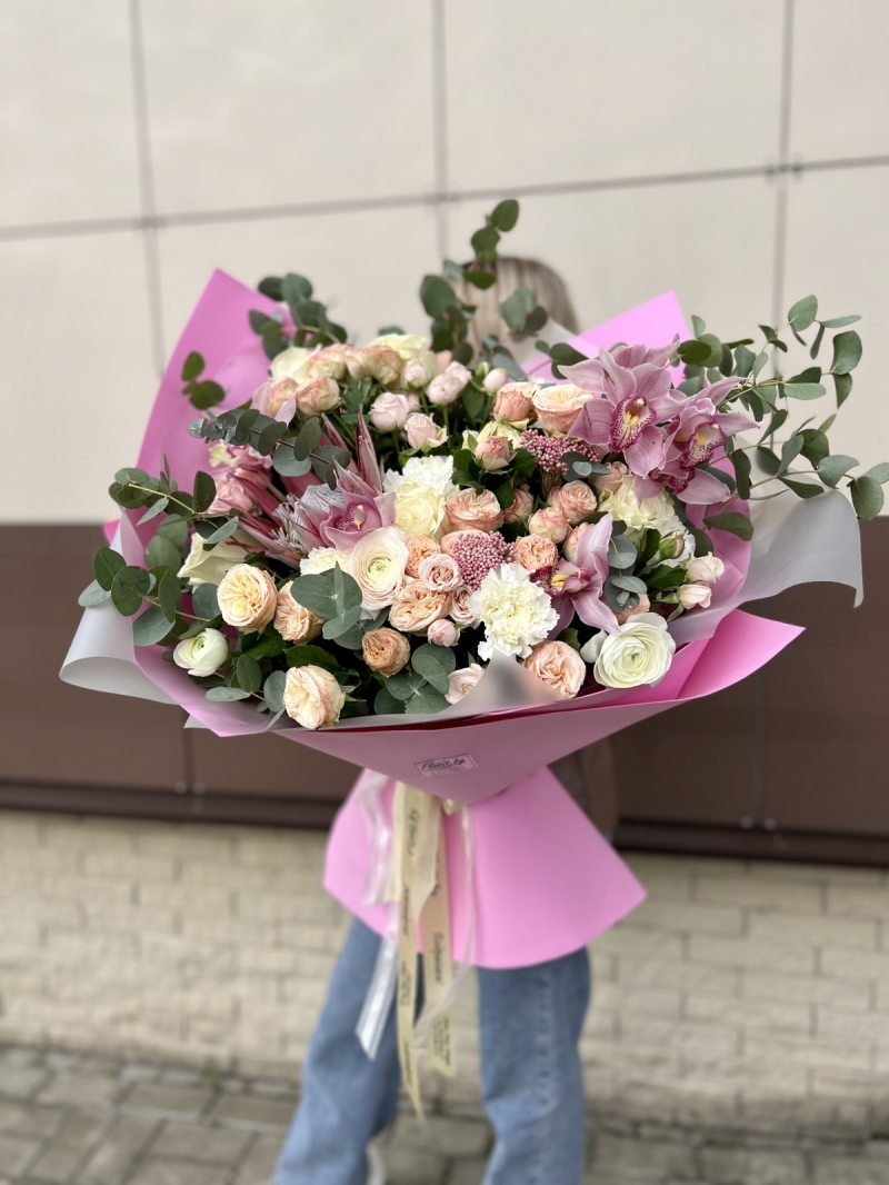 Состав: Кустовые розы, орхидея, озатамнус, протея, эвкалипт, упаковка, лента