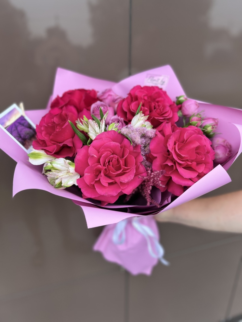Состав: 5 французских роз, альстромерия ,кустовая Роза , упаковка, лента
