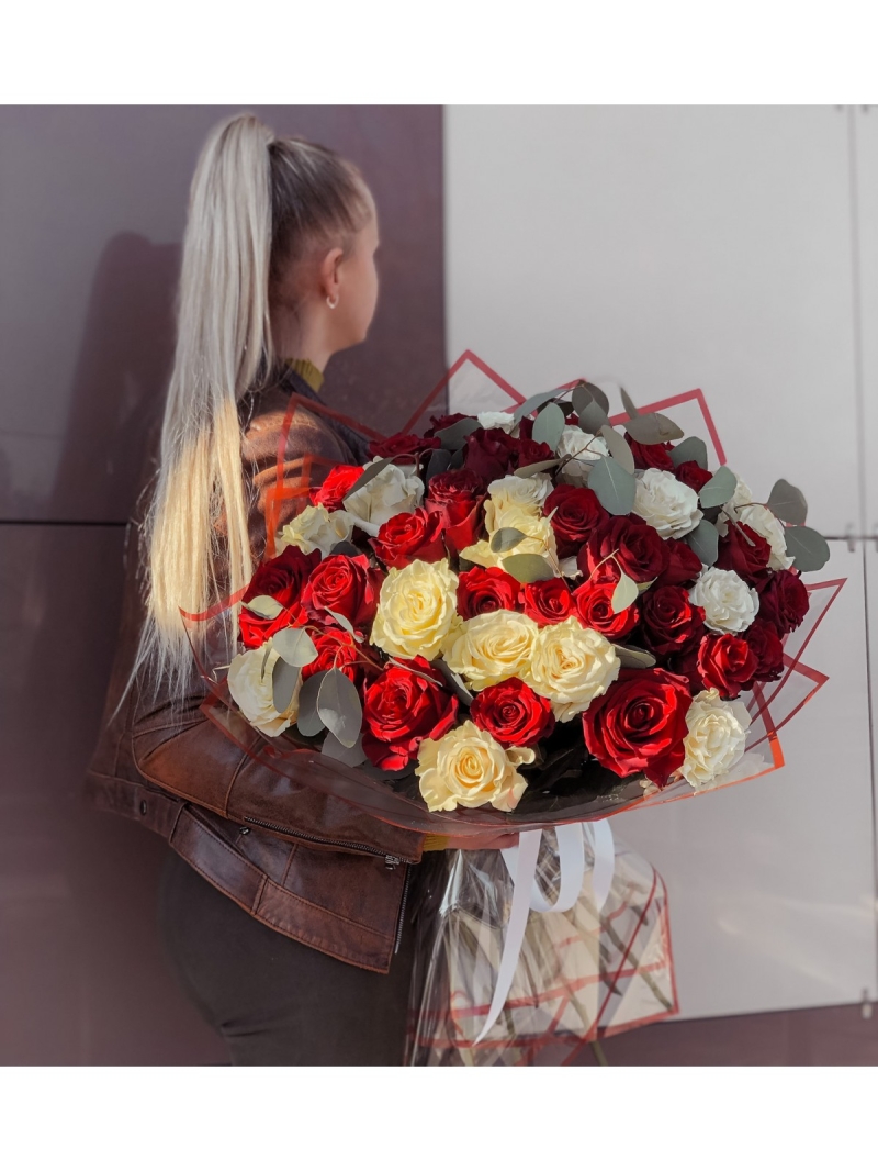 Состав: Букет из 45 роз Эквадор 60-70 см , эвкалипт, упаковка, лента
