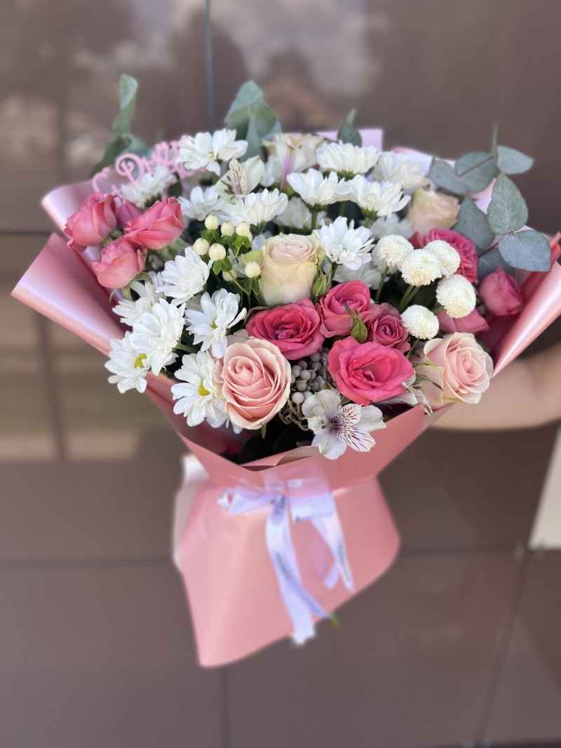 Состав: Хризантема, кустовая роза, роза, бруния, альстромерия , зелень , упаковка, лента