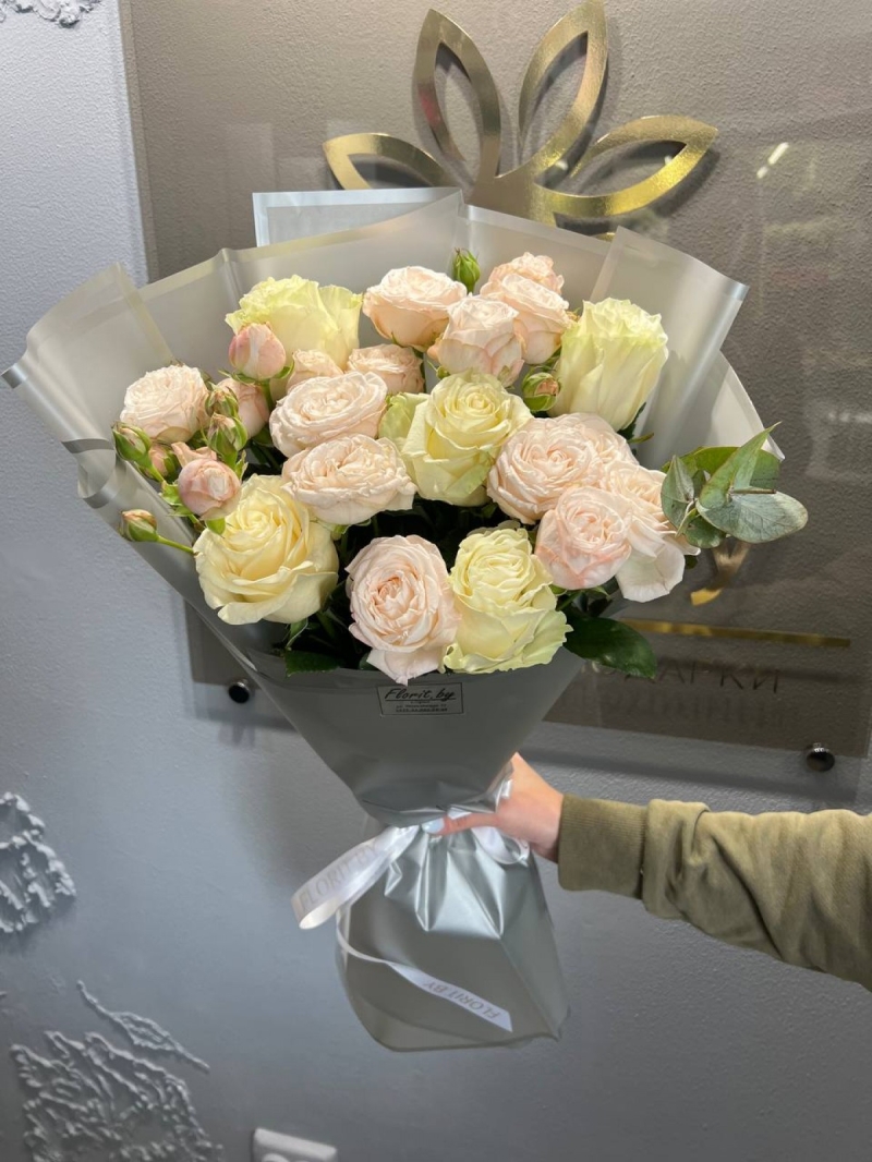 Состав: кустовая Роза, роза , зелень , упаковка, лента