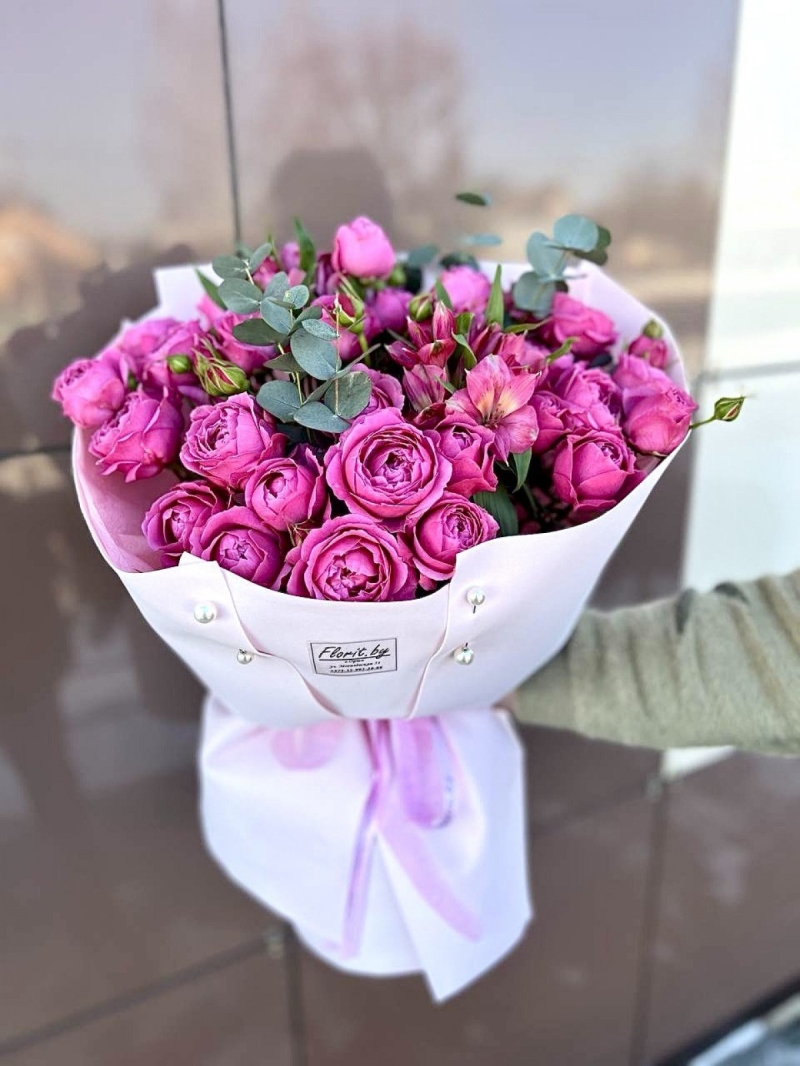Состав: 6 Кустовых роз, 3 альстрометрии , 2 эвкалипта , упаковка, лента, флористические булавки