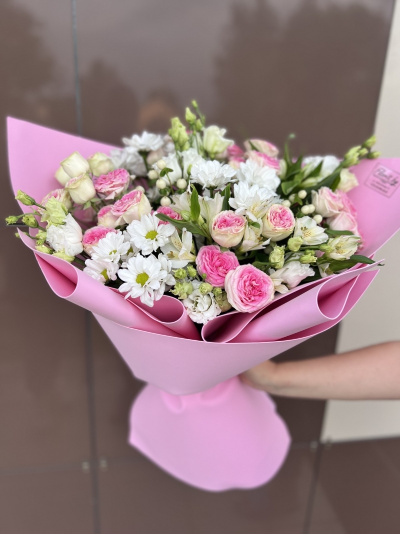 Состав: кустовые розы, хризантемы, Эустома, альстромерия, гиперикум, упаковка, лента