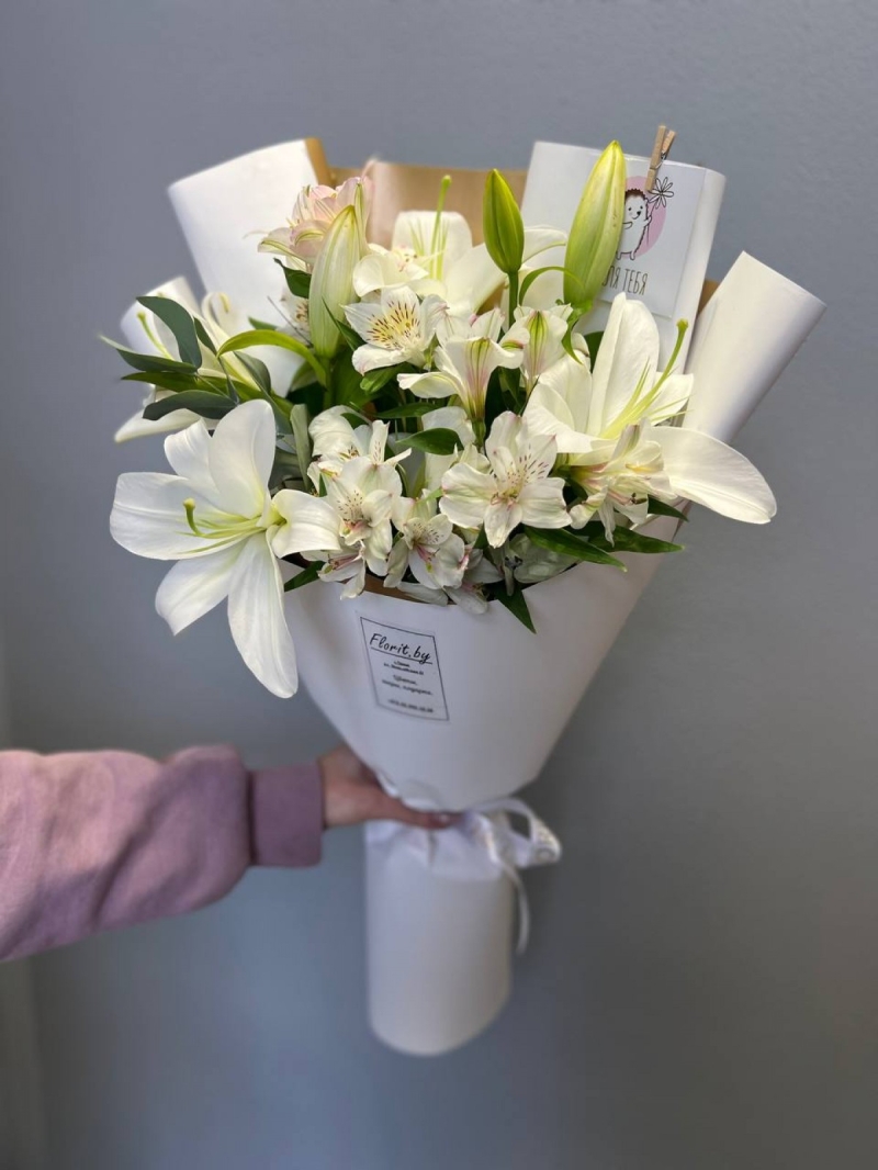 Состав: 3 Лилии , 4 альстромерия , упаковка, лента