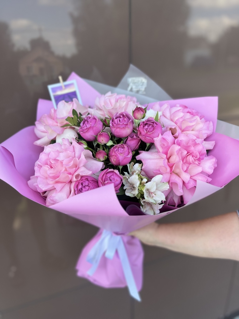 Состав: Французская роза, кустовая Роза, альстромерия,упаковка, лента