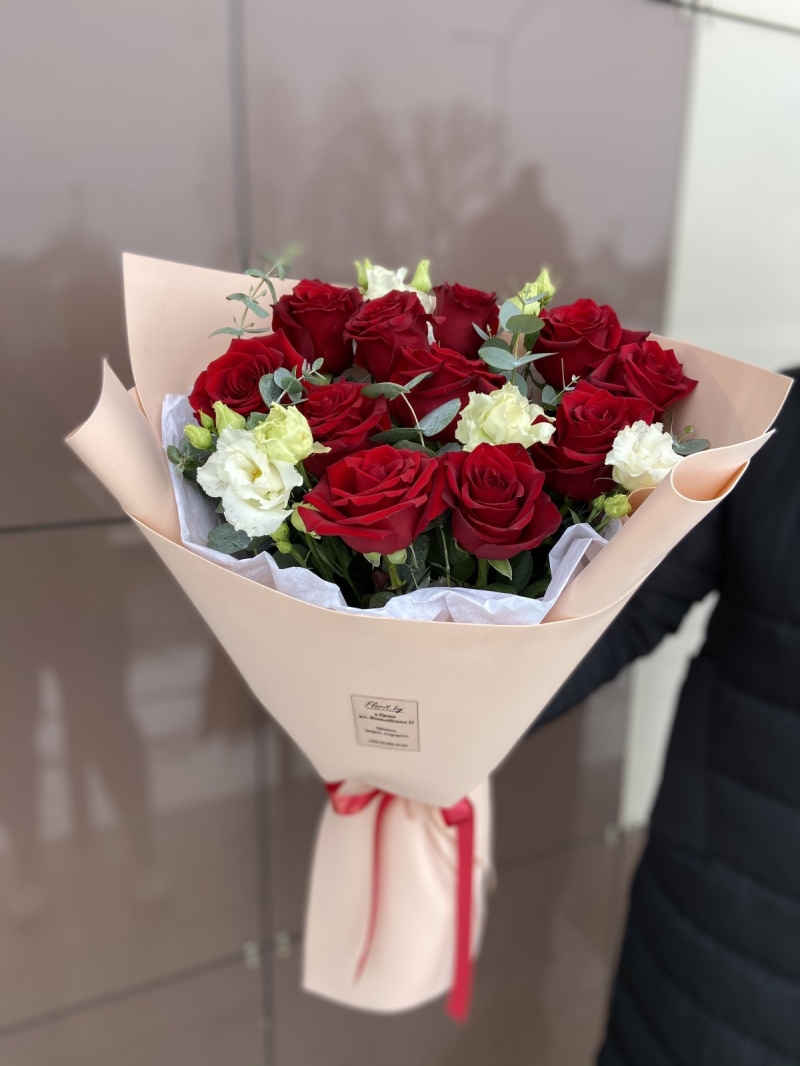 Состав: 11 роз, эустома , зелень, упаковка, лента