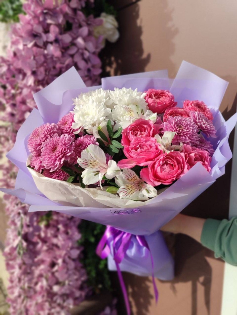 Состав: Кустовая Роза, хризантемы, альстромерия зелень, упаковка, лента