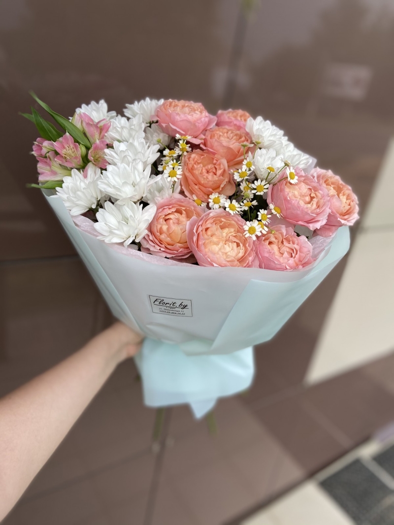 Состав: Кустовая Роза, хризантемы, альстромерия , лента, упаковка