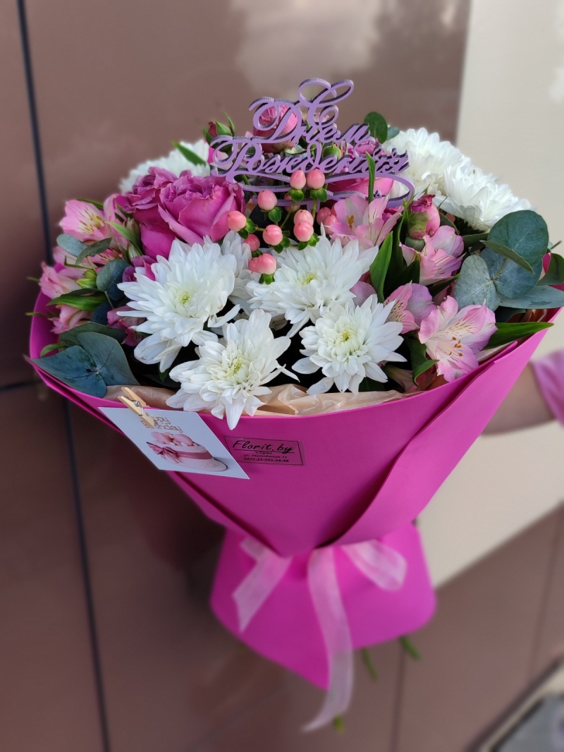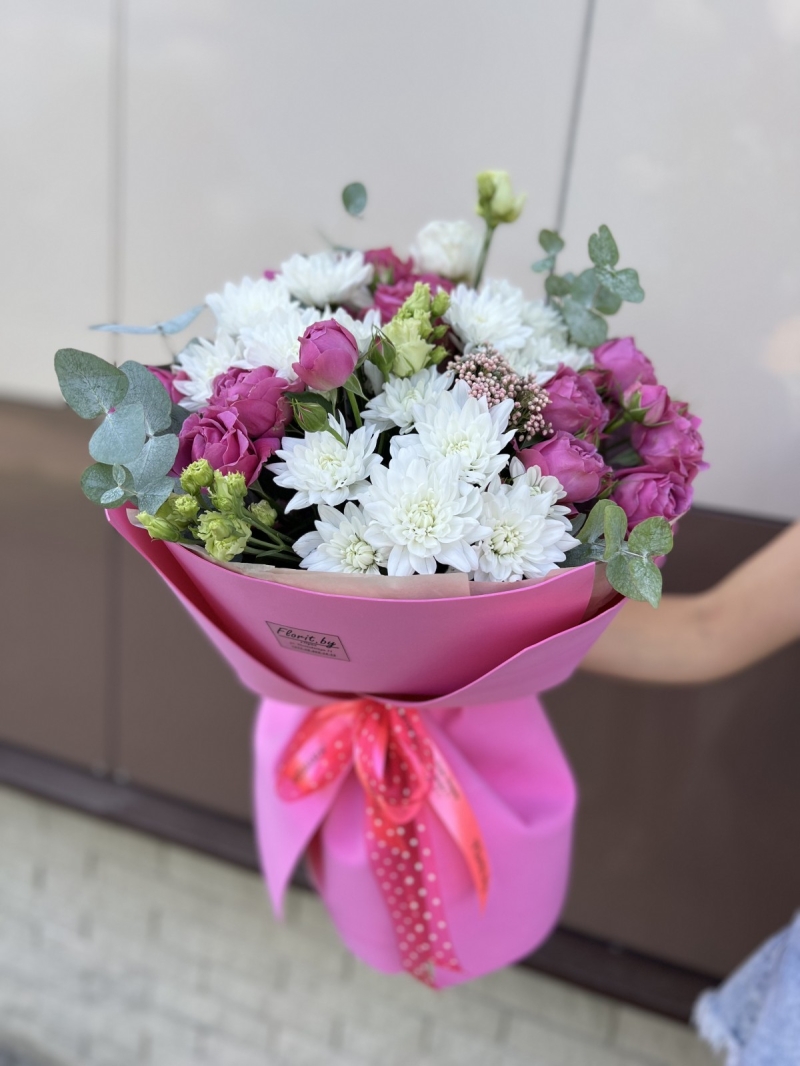 Состав: Хризантемы, кустовые розы , альстромерия, зелень , лента, упаковка