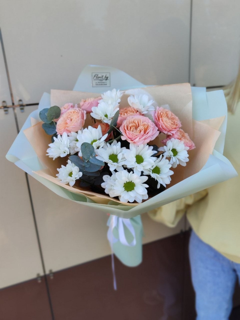 Состав: Кустовых Розы, хризантемы, зелень, упаковка, лента