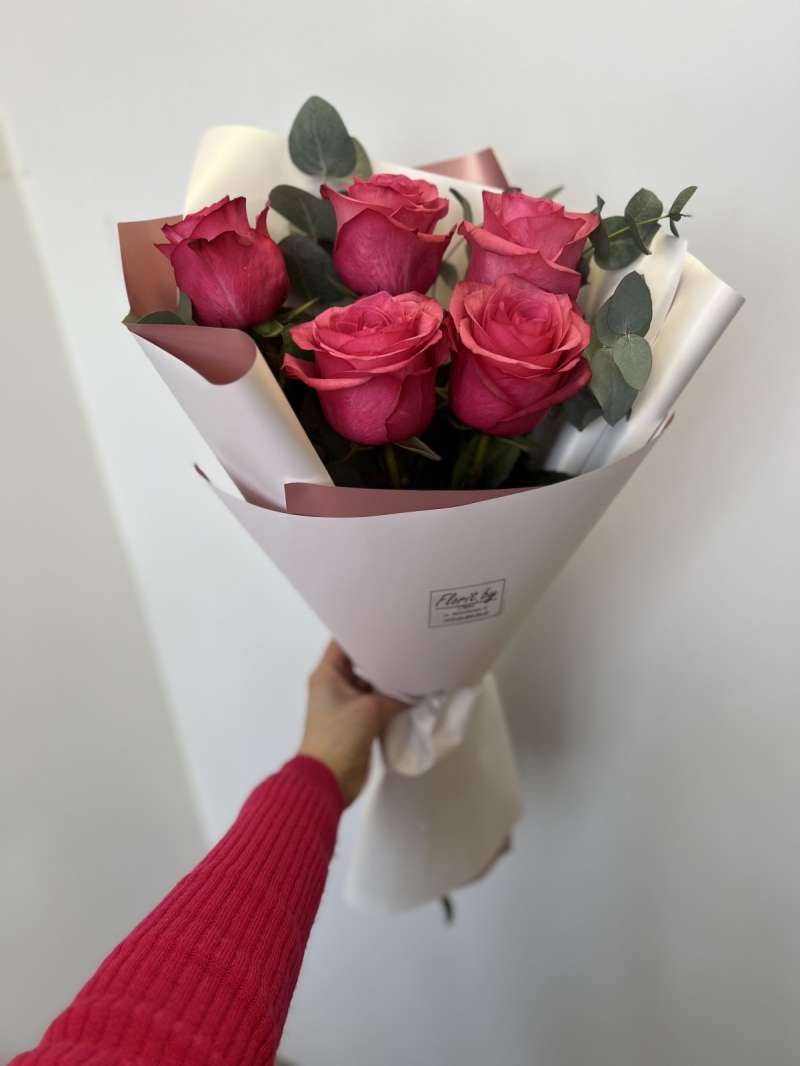 Состав: Букет из 5 розы Эквадор , эвкалипт, упаковка, лента
