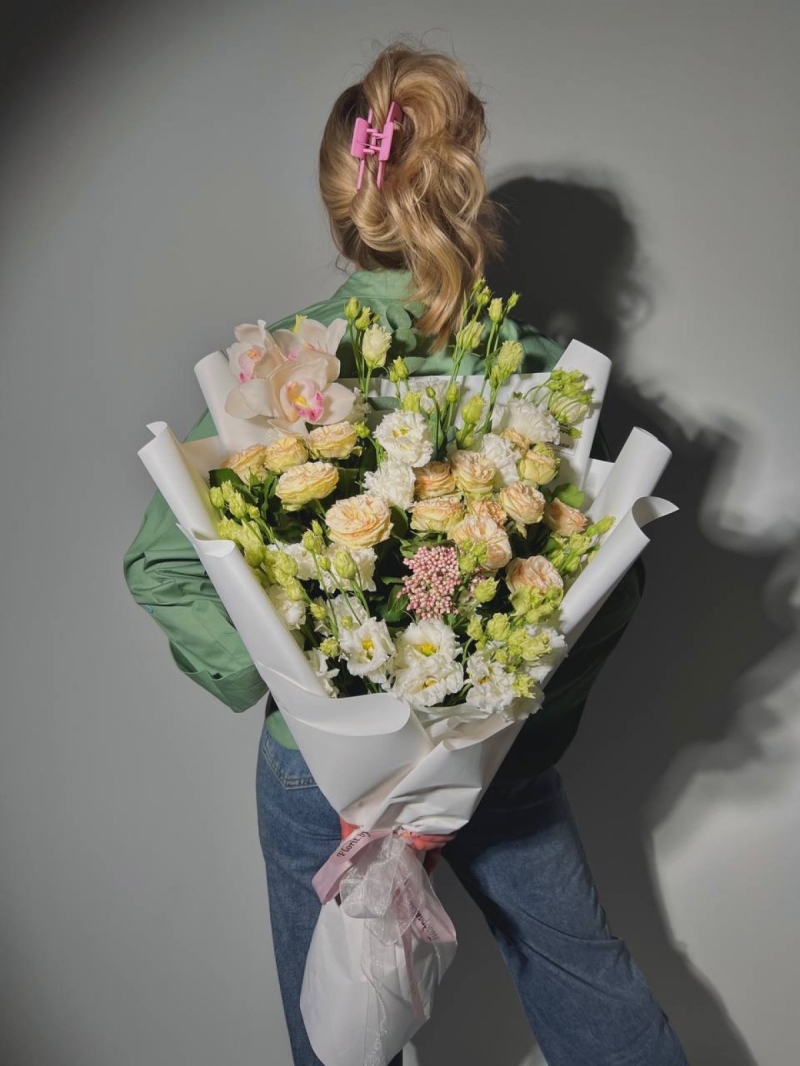 Состав: кустовая роза, эустома, озатамнус, орхидея, упаковка, лента
