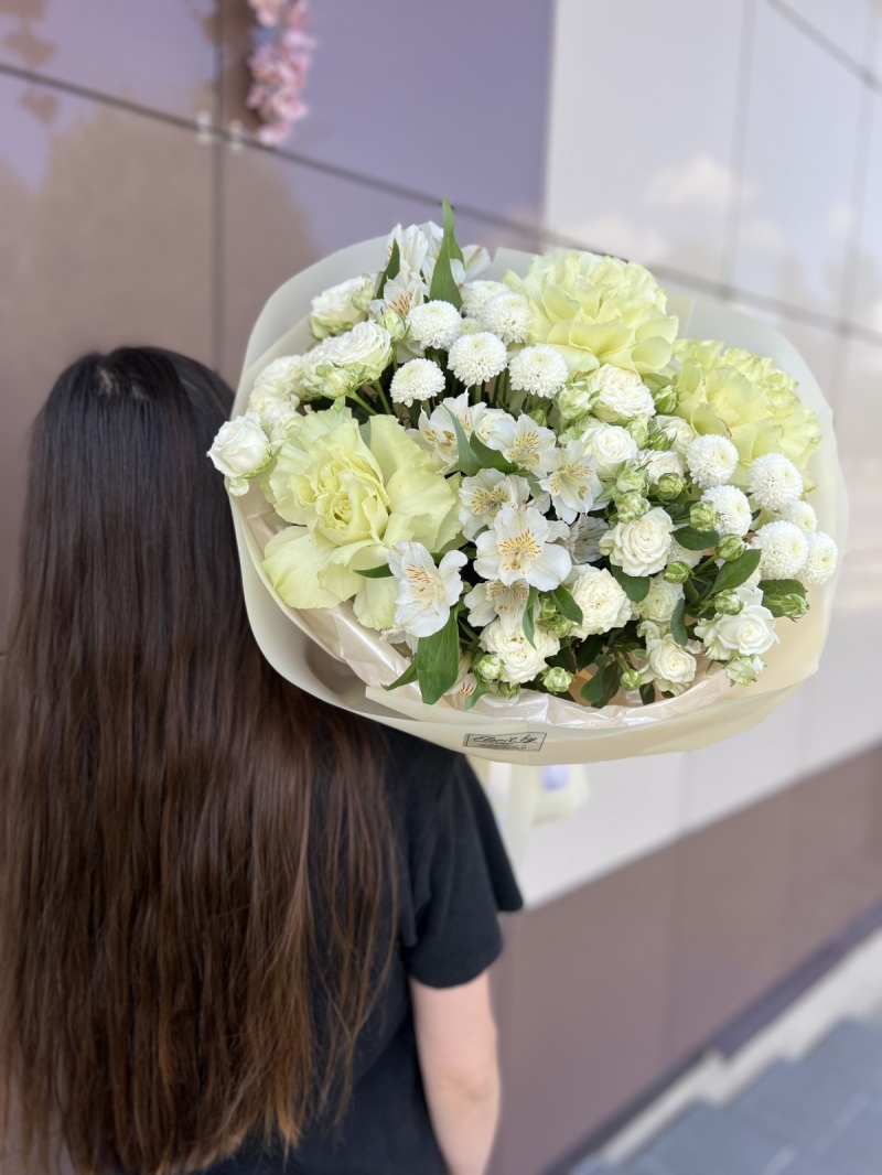 Состав: 3 французских розы, кустовые розы, хризантема, альстромерия , упаковка, лента