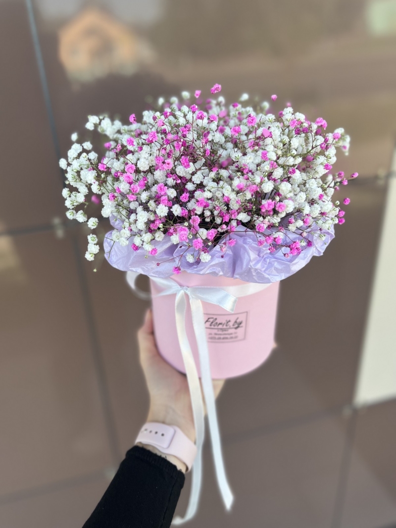 Состав: гипсофила цветная, лента, флорпена, коробка