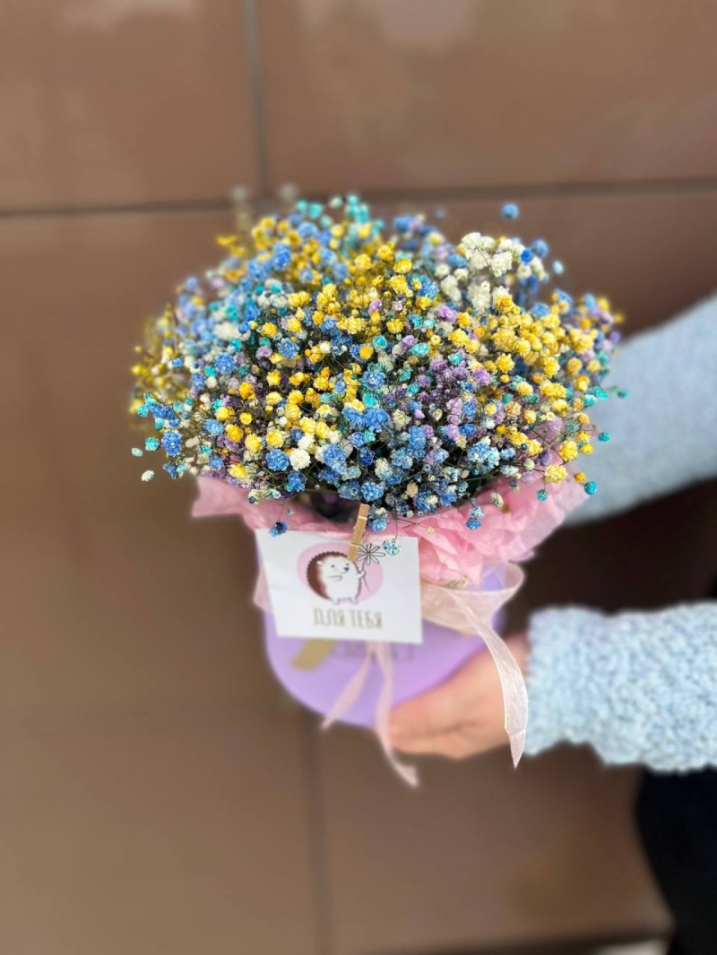 Состав: Гипсофила, лента, флористическая губка, коробка