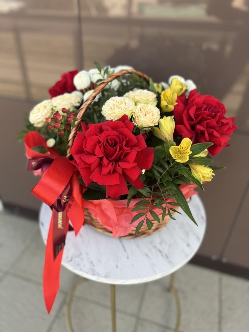 Состав: Французская розы, кустовые розы, гиперикум, альстромерия, флористическая губка, корзина, лента