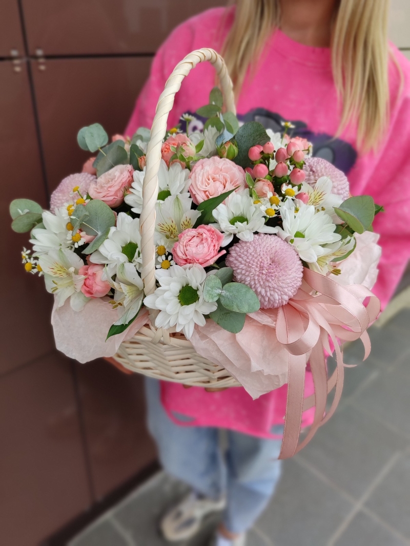 Состав: Хризантемы, гиперикум, танацетум, альстромерия , эвкалипт, корзина, губка, лента